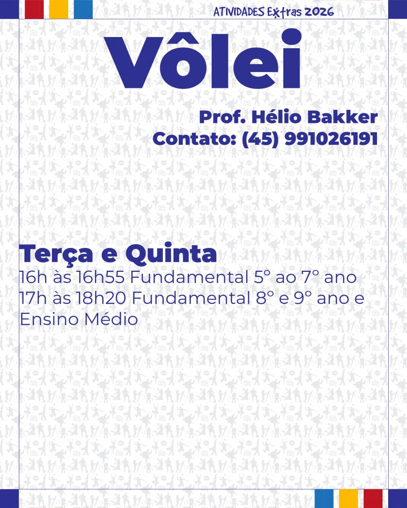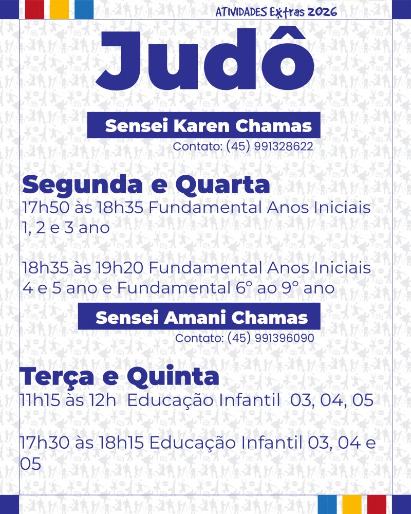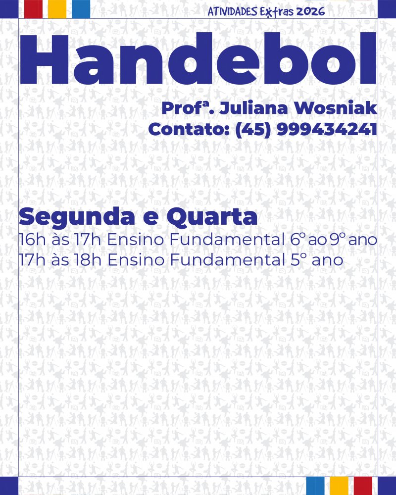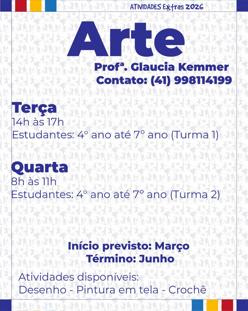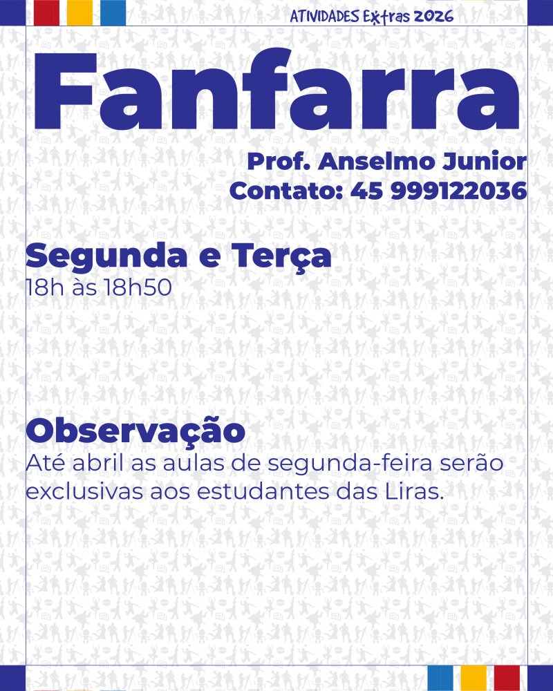Informamos que estão abertas as inscrições para as Atividades Extras 2026. Com exceção da Fanfarra, as atividades serão realizadas de forma terceirizada por profissionais parceiros.